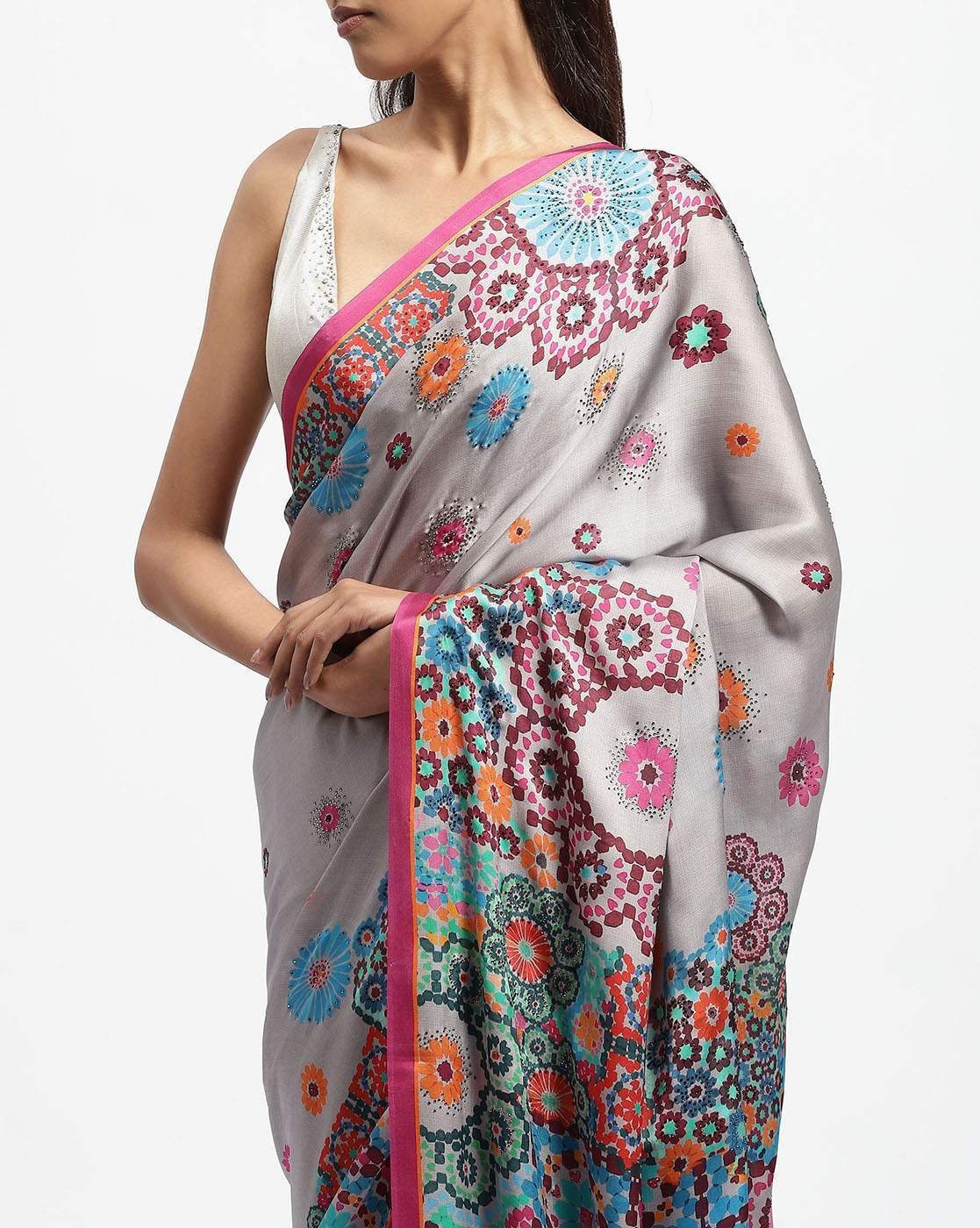 • Flowers bloom in a geometric mosaic on this silk satin saree embroidered with crystals. Ideal for shaping minds.