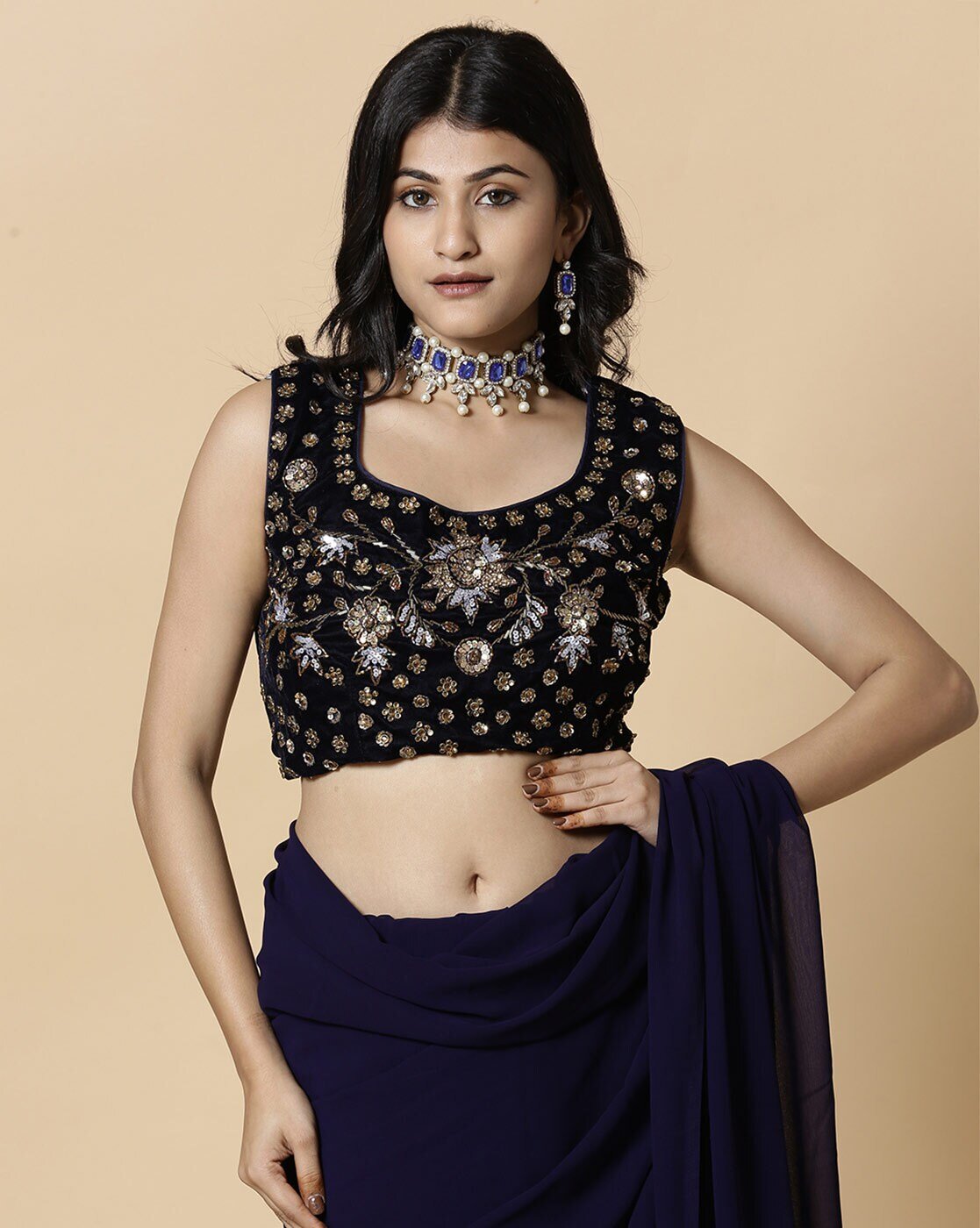 - The last image gives a detailed look of the blouse piece that comes with this saree (The model is wearing a blouse from our in-house wardrobe)